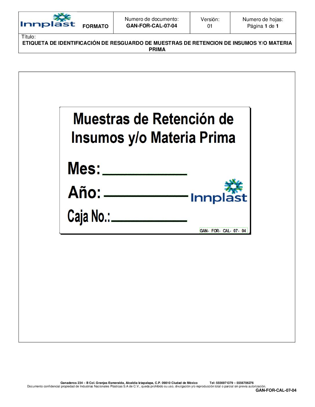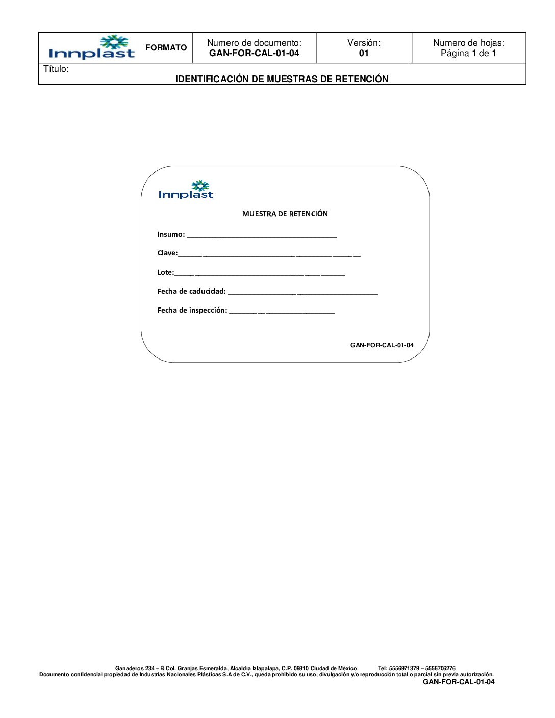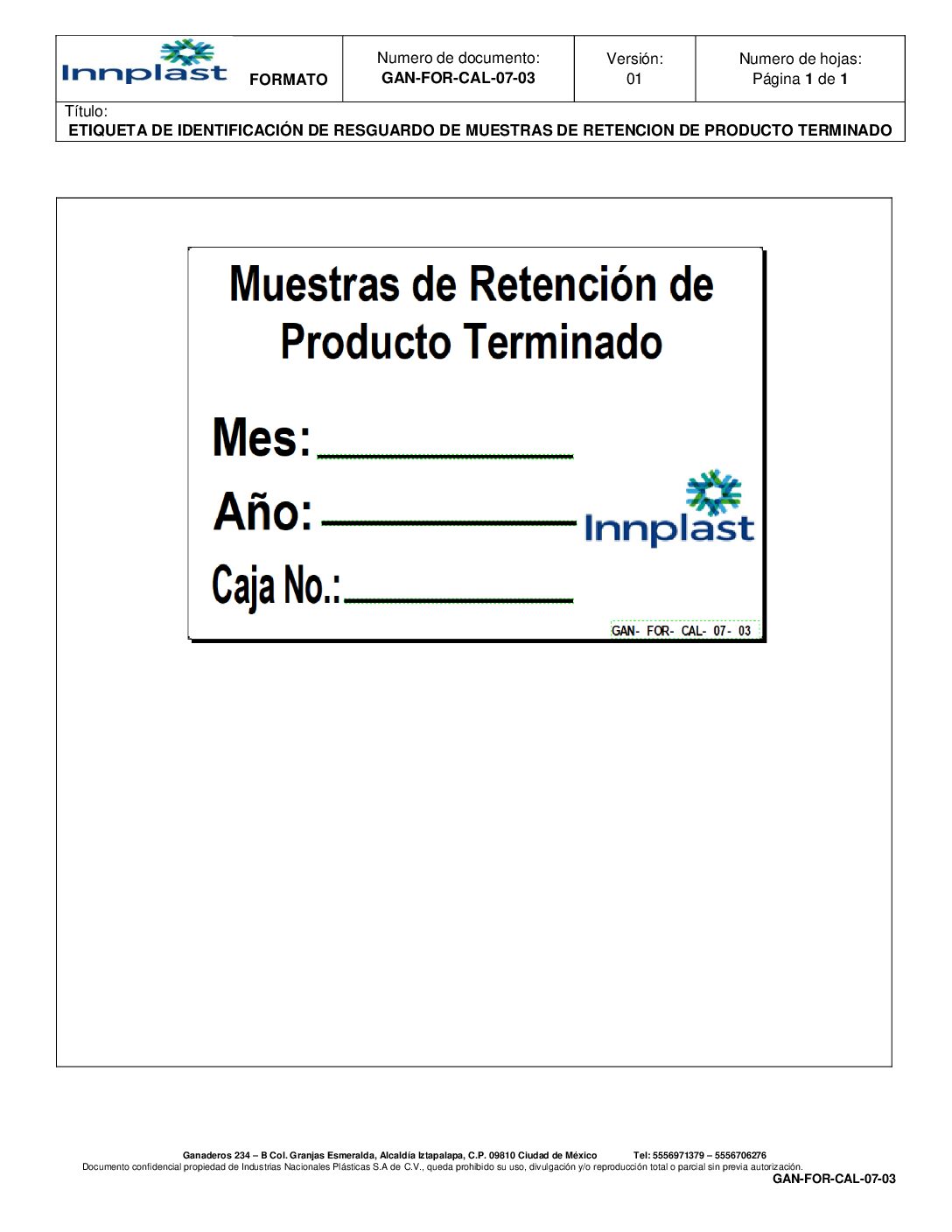 Etiqueta de Identificacion de Resguardo de Muestra de Retención de PT