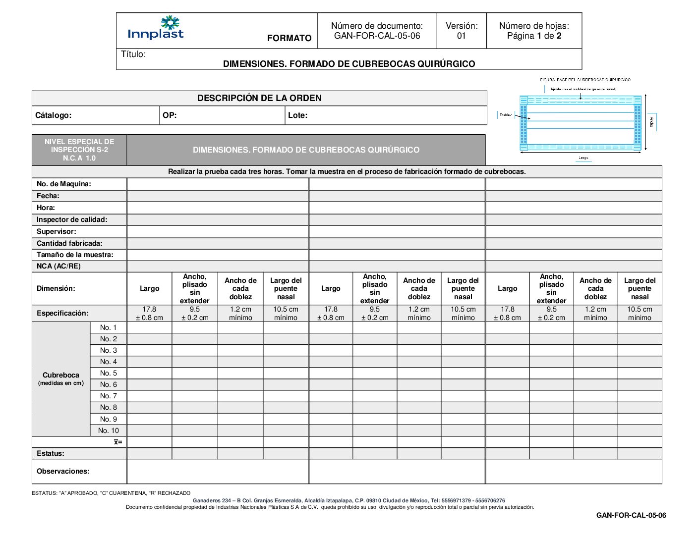 Dimensiones. Formado de Cubrebocas Quirúrgico