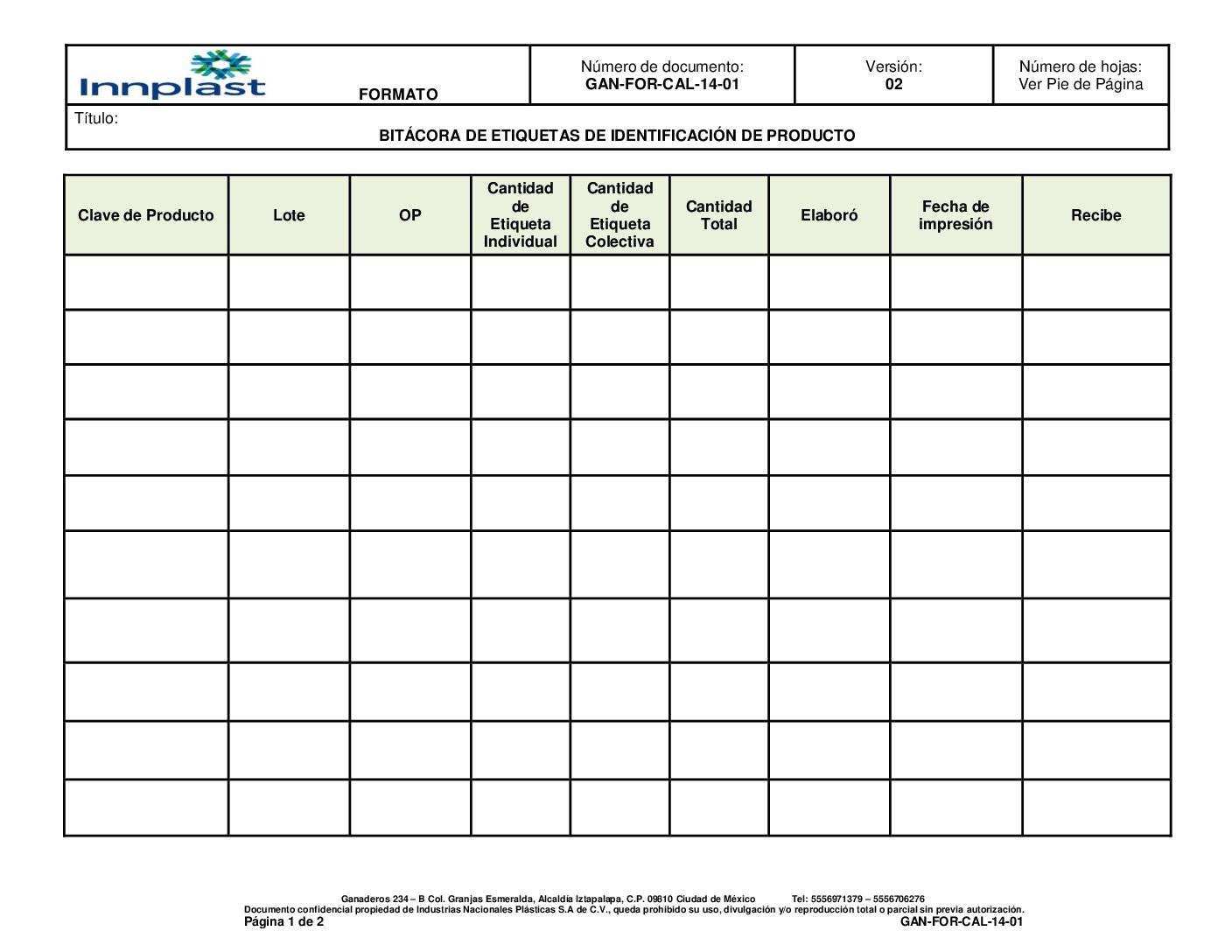 Bitácora de etiquetas de identificación de producto